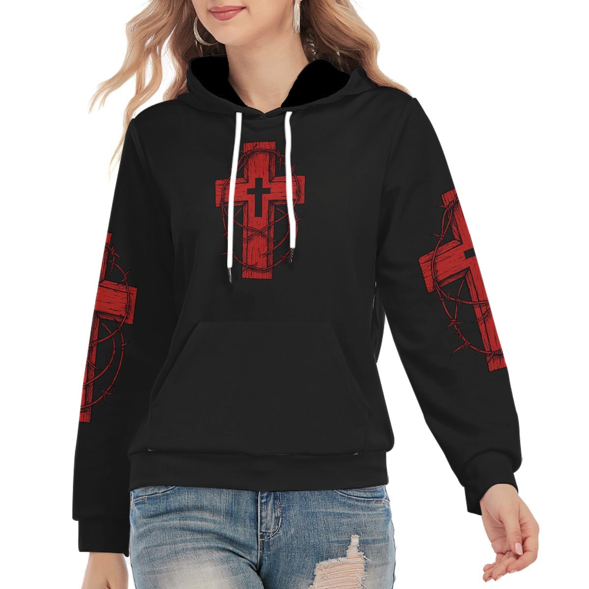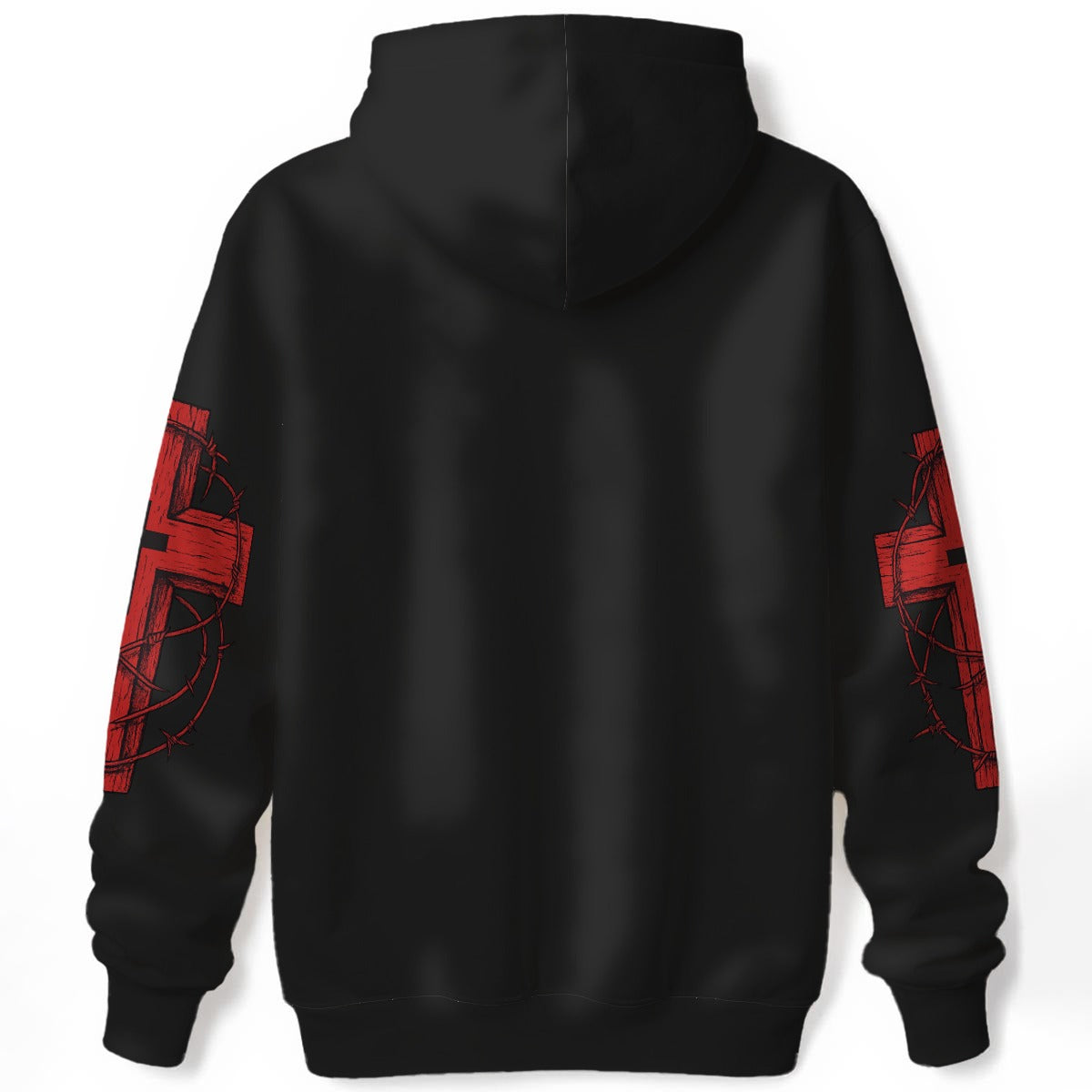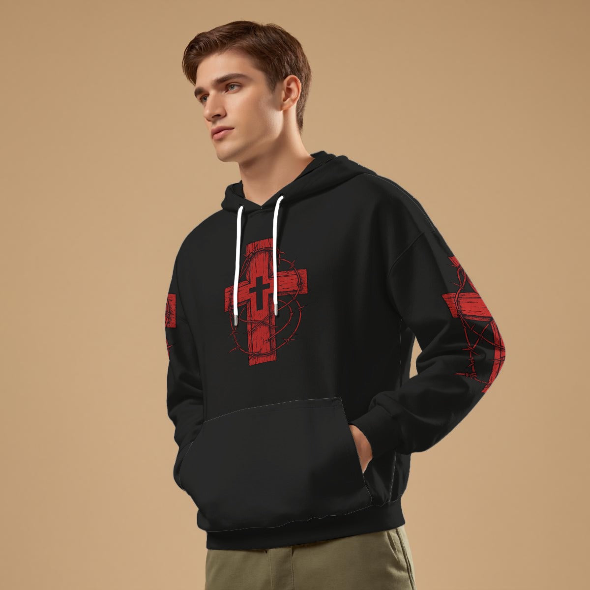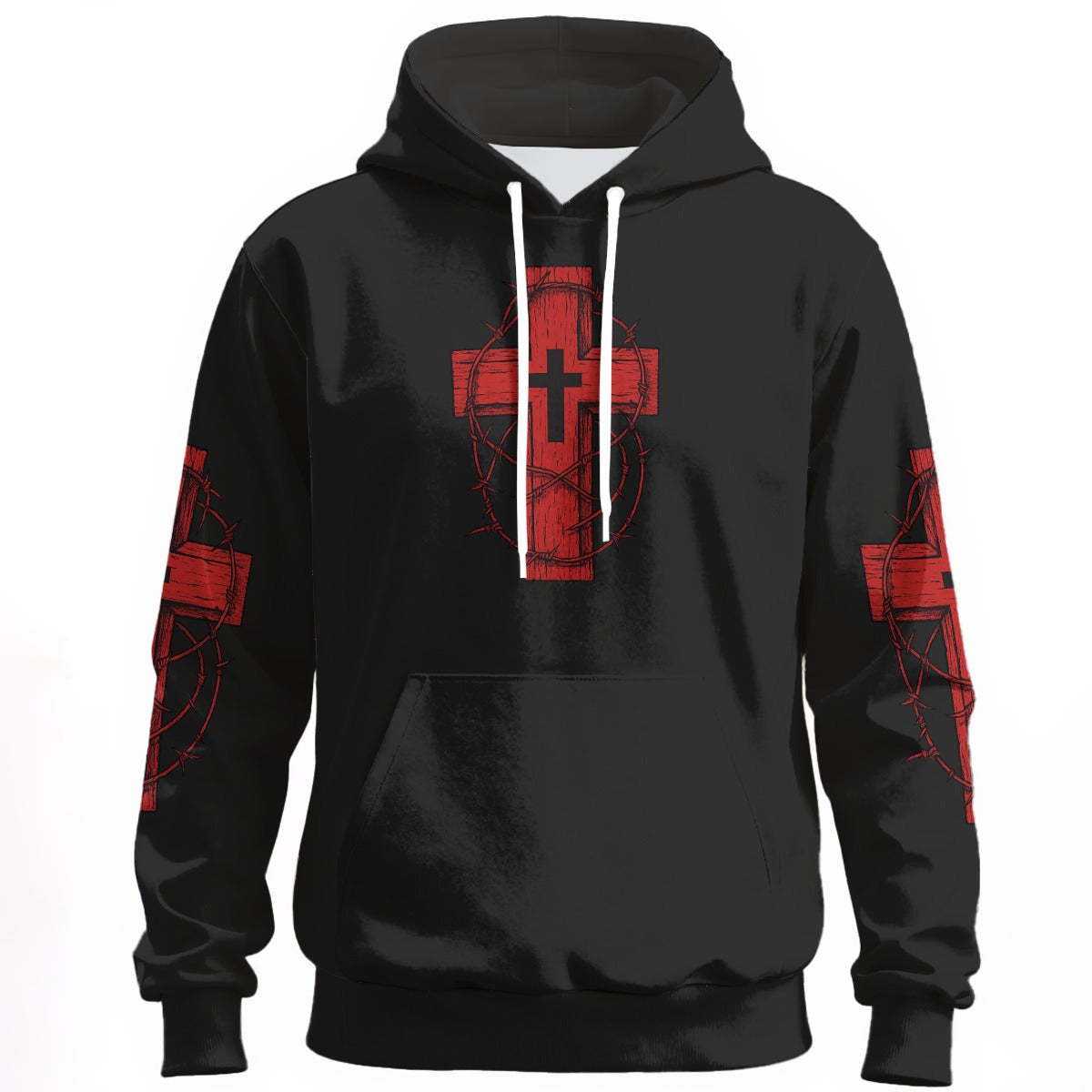 Goth-huppari punaisella ristillä ja orjantappurakruunulla