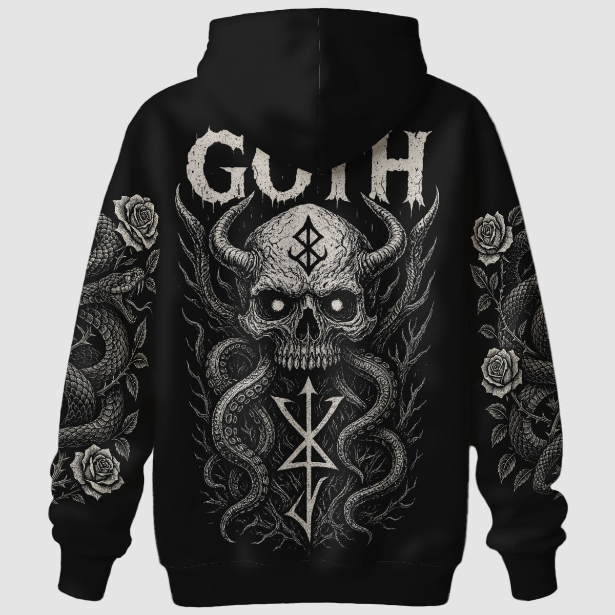 Ilmaise yksilöllisyyttäsi ainutlaatuisella "The Serpent’s Oath" -hupparilla, joka on luotu goottilaisen estetiikan ja vaihtoehtoisen muodin ystäville. Tumma design, jossa on pääkallon, käärmeiden ja ruusujen motiiveja, symboloi voimaa, salaperäisyyttä ja sisäistä rauhaa. Tämä ei ole vain vaate – se on tyylin manifesti.