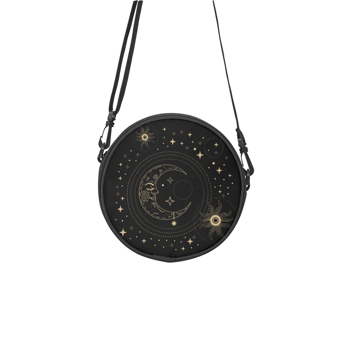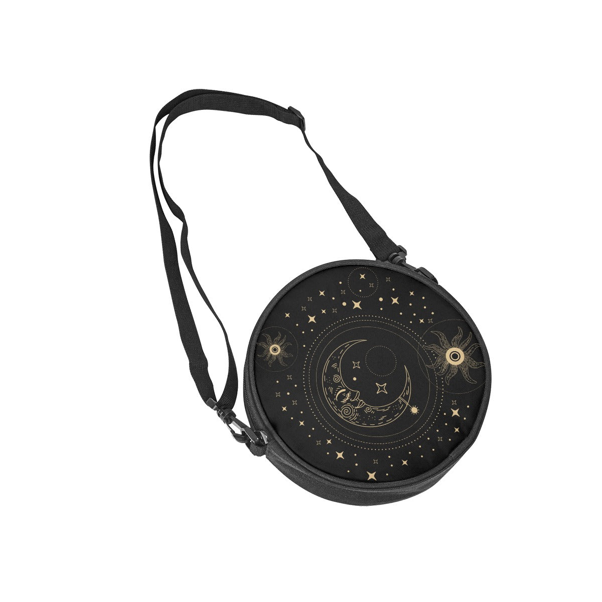 Musta pyöreä laukku, jossa on kuu- ja aurinkokuvio, boho gootti -tyyliä