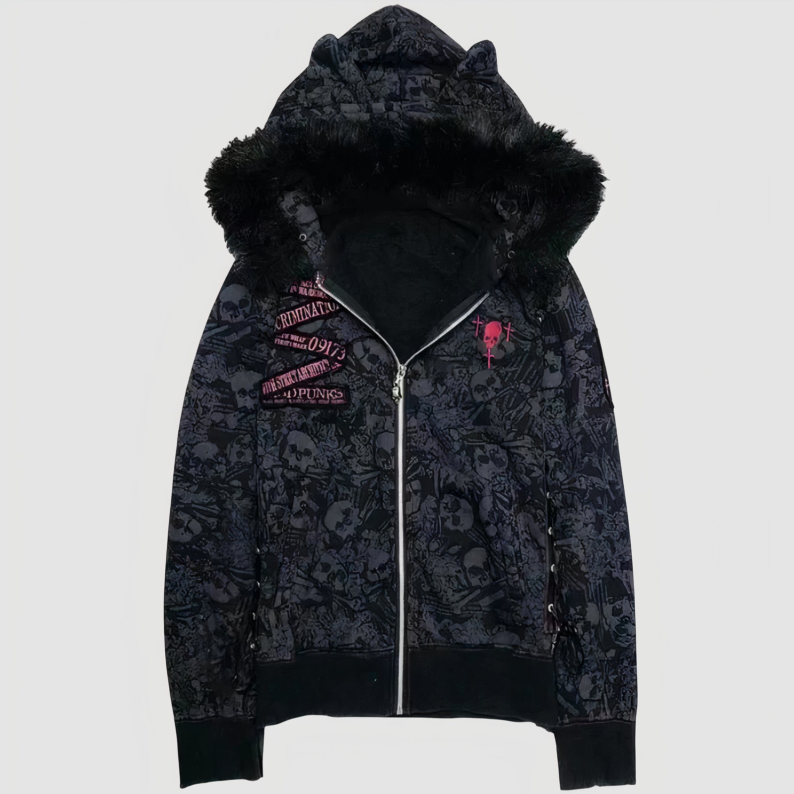 - Koristeet: kirjailut, pääkallot, kontrastiset lisäosat, taskut